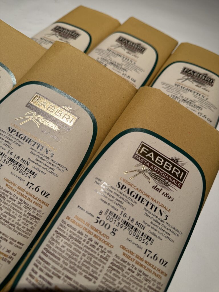 ファッブリは1893年創業、トスカーナの丘陵地帯で代々続く家族経営の工房です。100年以上にわたり、彼らは変わらぬ製法を守り続けてきました。原料には有機栽培のデュラム小麦を使用し、石臼で丁寧に挽き、ブロンズダイスで成形。これにより表面がざらりとした質感を持ち、ソースがしっかりと絡むのです。